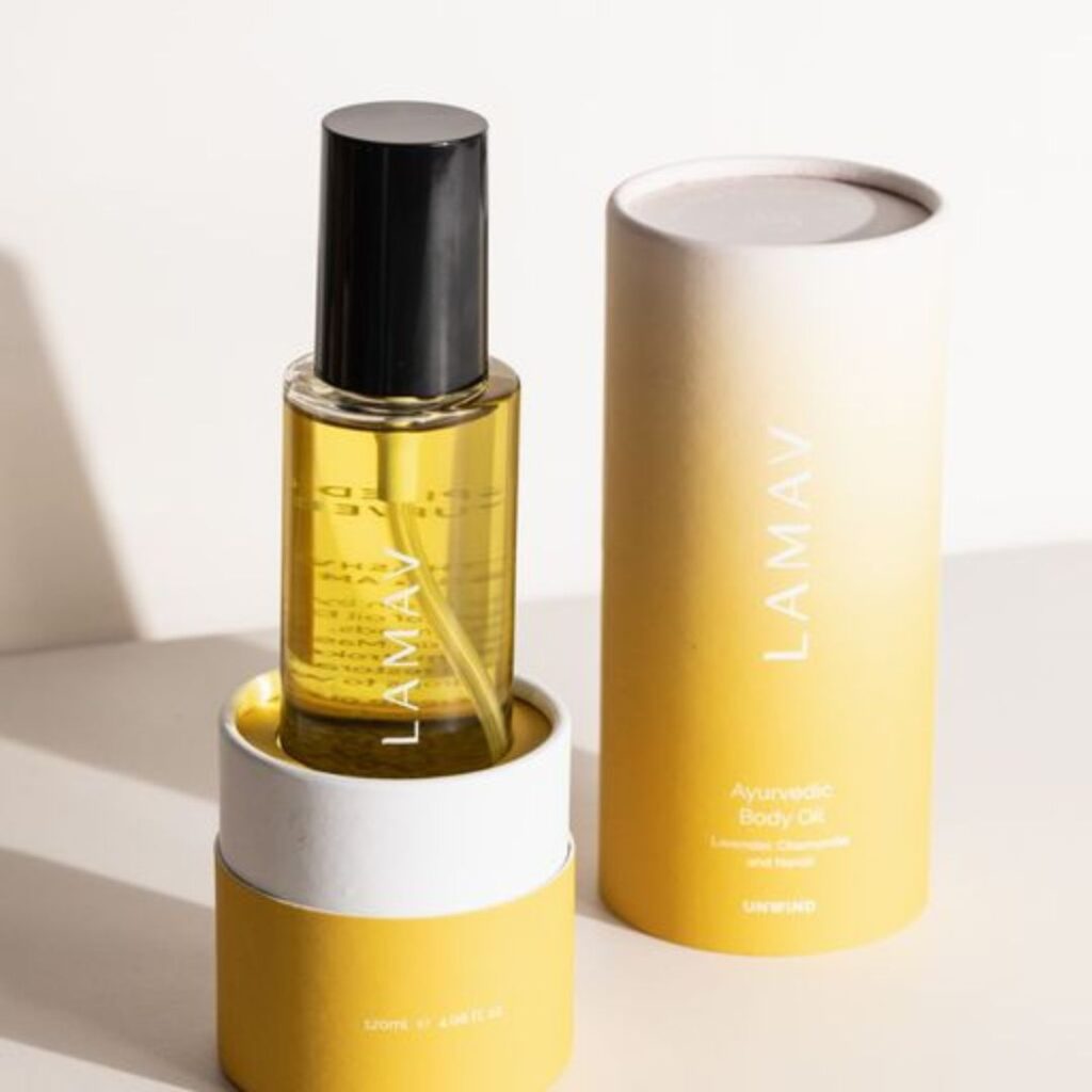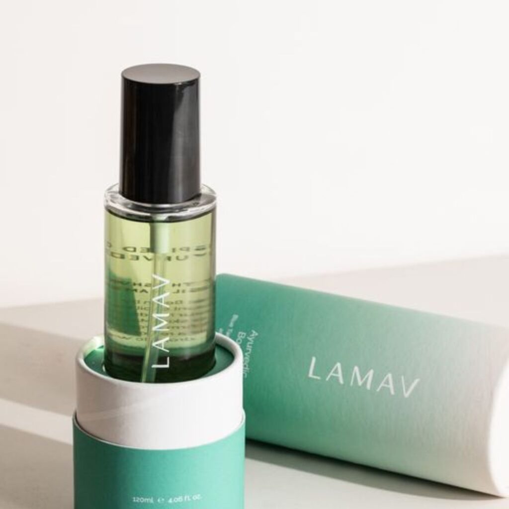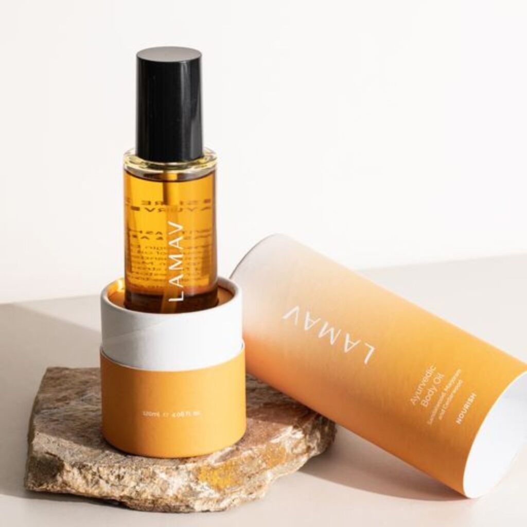 - Before showering, warm your preferred LAMAV Ayurvedic Body Oil by placing it in hot water until it reaches your desired temperature.