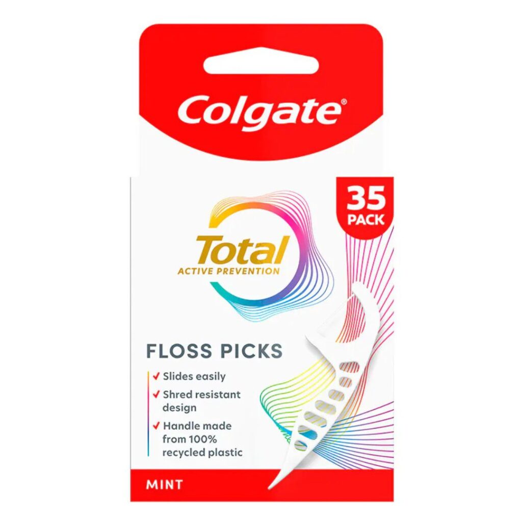 The Colgate Total Active Prevention Floss Picks slide easily between teeth, with a shred-resistant design. An important part of your daily oral hygiene routine, the Total Floss Picks help fight the root cause of: plaque, tartar buildup, tooth decay between teeth and along the gumline. Designed for a more enjoyable flossing experience, the mint flavoured floss also features a flexible, lightweight handle for easier cleaning and a pick for additional interdental needs; whilst also giving you peace of mind that the Floss is PFAS free with a handle made from 100% recycled plastic.