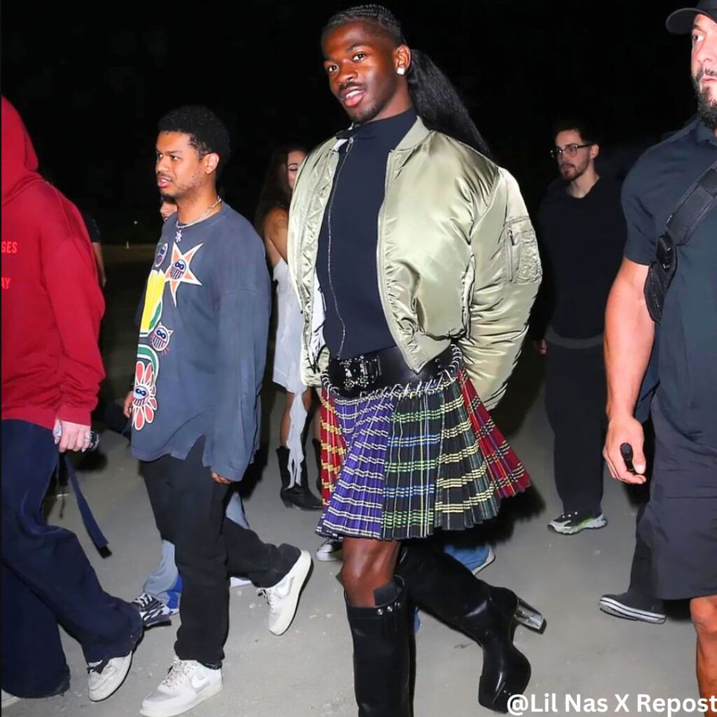 Lil Nas X wore a cropped bomber jacket with a black turtle neck, Chopova Lowena plaid mini skirt and leather Rick Owens knee boots. He pulled off that outfit so well, deserving of icon status!
