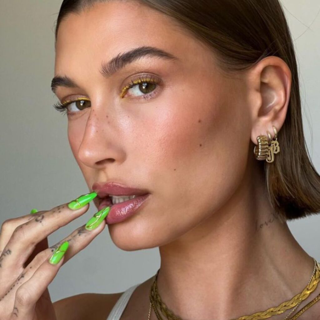 Hailey wore a white crop top with some light-wash jeans and for her accessories she wore a black street ahead belt, Mejuri earrings and a gold body chain. but what mostly stood out to us was her nails! Hailey swapped out her usual glazed nails for an amazing set of neon claws for Coachella and it’s safe to say we are all obsessed. here is a list of products that will help you achieve this look at home!