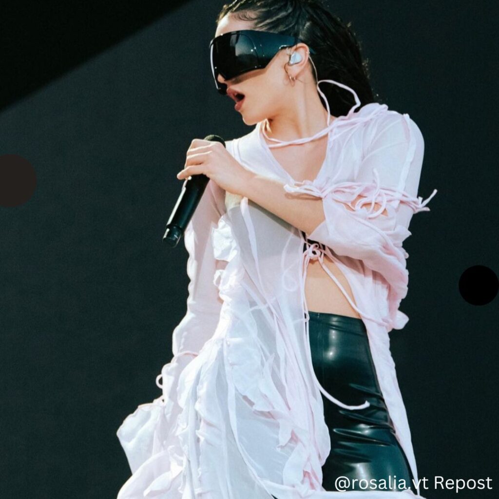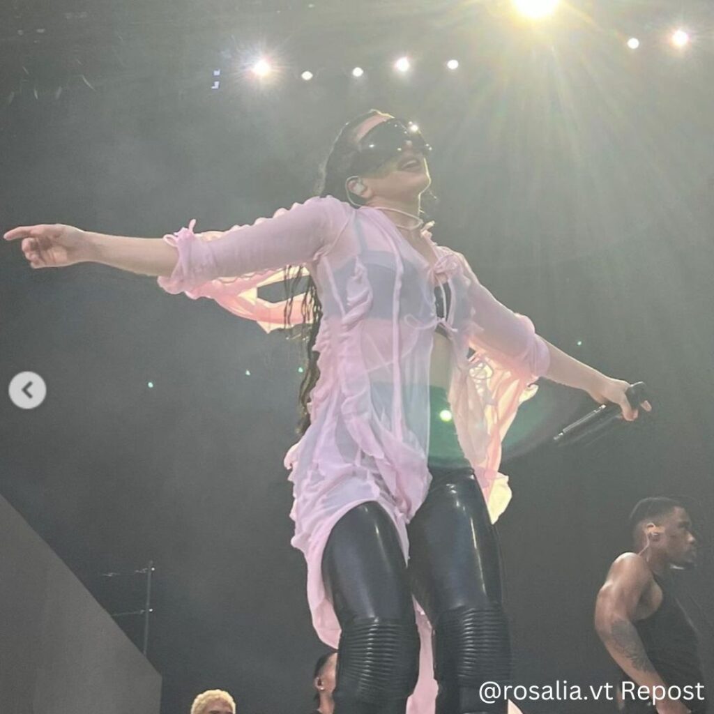 Rosalía wore a pink billowy top by Acne studios with a black corset top, form-fitting leggings and for her accessories she wore futuristic Rick Owens sunglasses and eyebrow slits and she looked phenomenal!