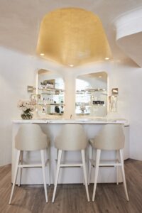 With its curved walls adorned with polished plaster and ceilings hand-painted with a gold leaf motif, the interiors of the atelier are intimate, gratifying and tranquil. The elegantly crafted furniture by Blainey North Collection is a tribute to luxury style and Parisian couture houses with shelves fashioned from leather and lacquer and armchairs adorned with elegant boucle.