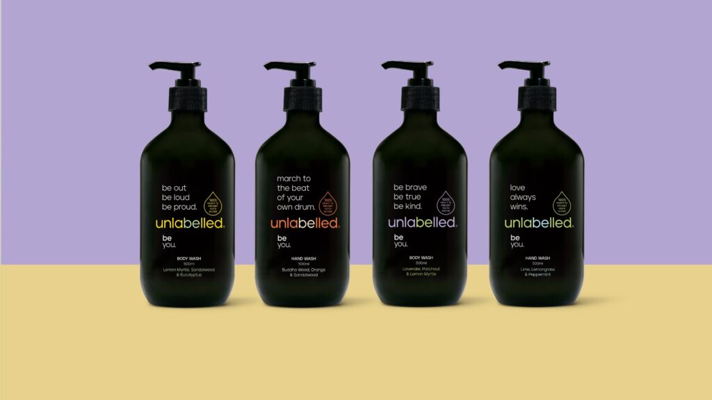 Unlabelled Loud and Proud range of will be available in time for Sydney WorldPride 2023. The range comprises three hand washes, three body washes, and two body bar products housed in exclusive packaging with new splashes of colour and Pride messaging.