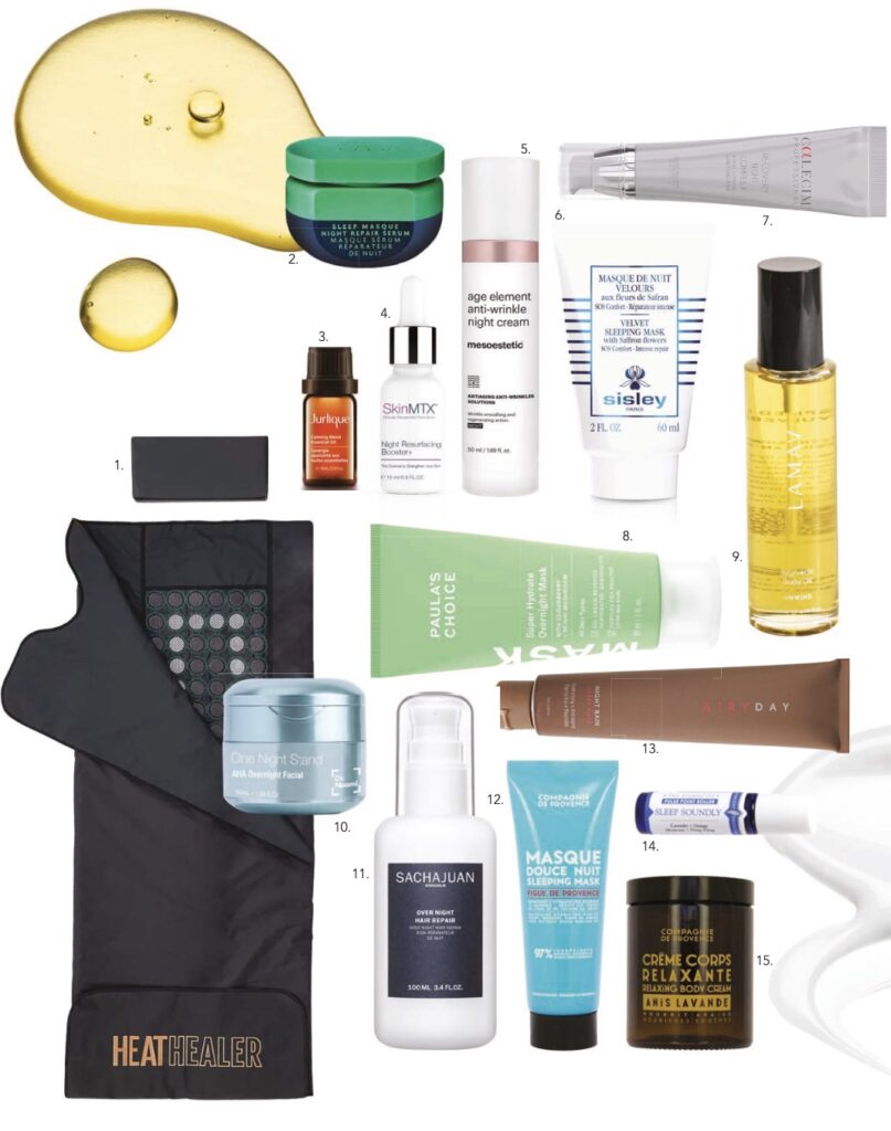 1. Heat Healer Infrared Sauna Blanket RRP $798, 2. Rogue Beauty R+Co Bleu Sleep Mask Night Repair Serum 56.7g, $230, 3. Jurlique Calming Blend Essential Oil 10ml, $36, 4. SkinMTX Night Resurfacing Booster+ 15ml, $79, 5. mesoestetic age element anti-wrinkle night cream, $179, 6. Sisley Velvet Sleeping Mask 60ml, $180, 7. CALECIM Recovery Night Complex 60g, $145, 8. Paula’s Choice Super Hydrate Overnight Mask, $49, 9. LAMAV Ayurvedic Body Oil in UNWIND, $49, 10. Dr Naomi Skin One Night Stand 50ml, $149, 11. Rogue Beauty Sachajaun, Over Night Hair Repair 100ml, $84, 12. Compagnie de Provence Antioxidant Fig Night Face Mask, $82, 13. AIRYDAY Night Rain Sleep Mask, $34.95, 14. Buckley and Phillips Gumleaf Essentials Pulse Point Roller Sleep Soundly 9ml, $19.95, 15. Compagnie de Provence Anise Lavande Body Cream, $69